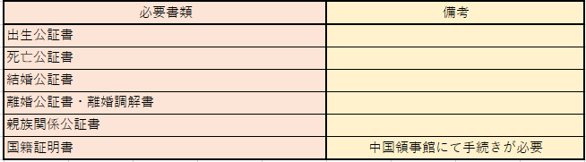 また、中国籍の方が帰化する場合は、上記除籍謄本や家族関係証明書に代わり、出生公証書等の中国本土で取得する必要がある書類や、日本の中国大使館で取得する国籍証明書などが必要になります。