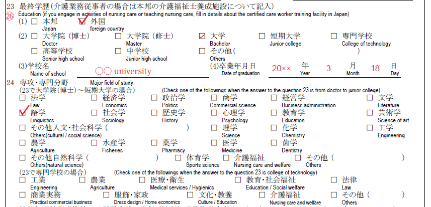 また、大学等で専攻した分野についても該当するものにチェックを入れます。