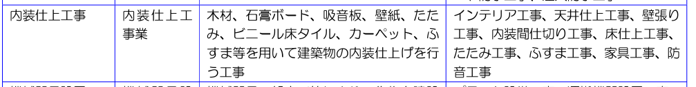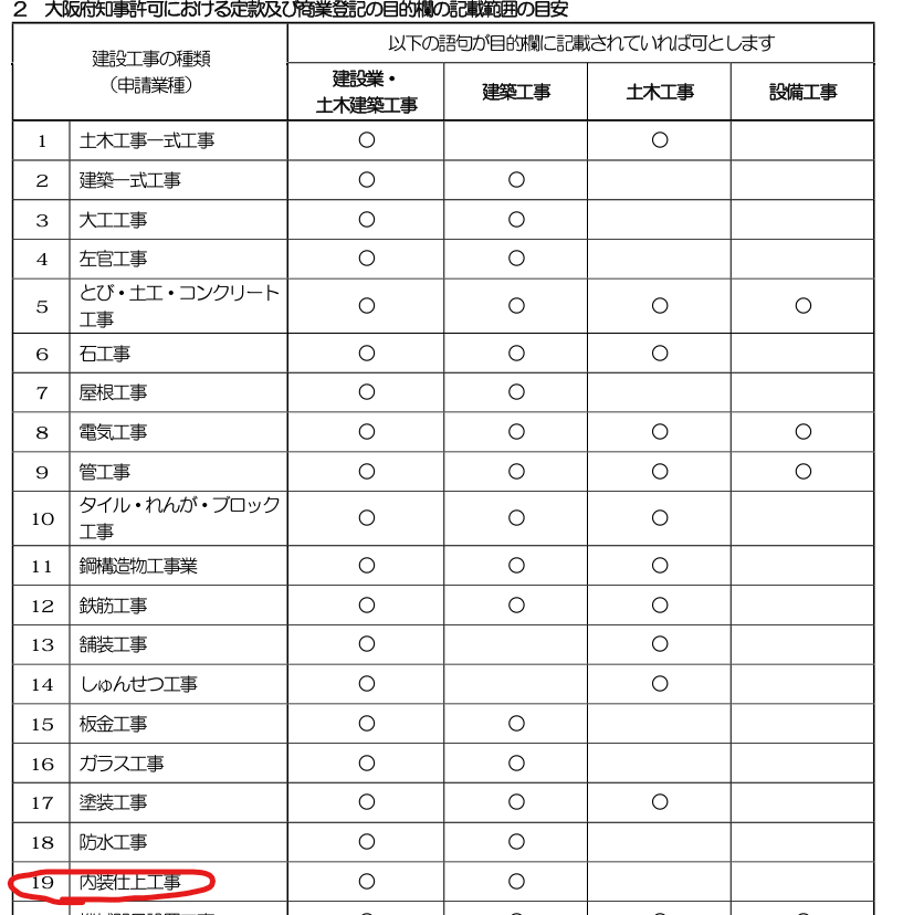 また、個別具体的に【内装工事業】【内装仕上工事業】等の目的があっても事業目的として当然認められます。